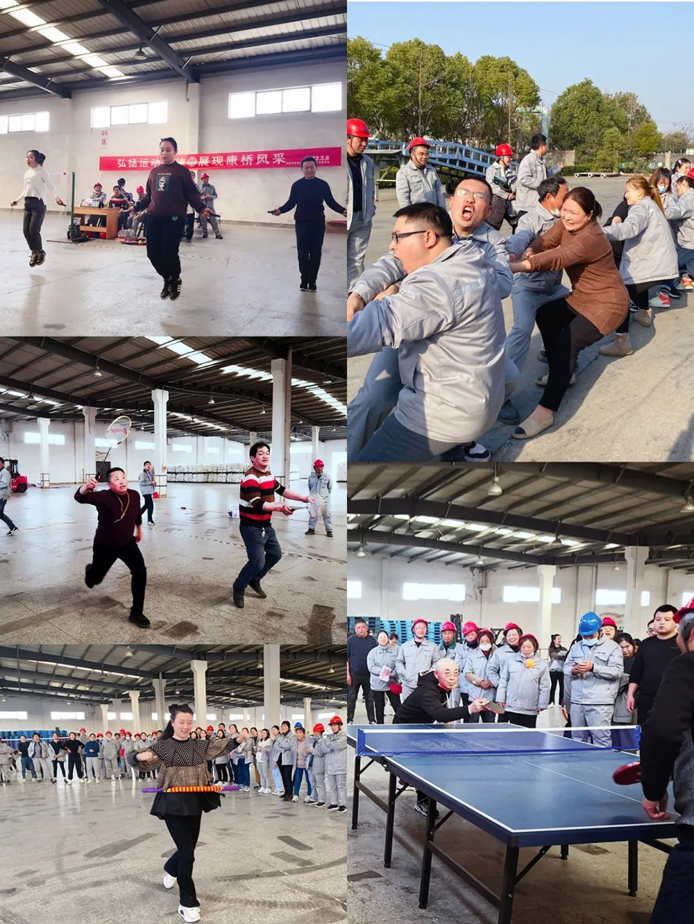 本次趣味運動會由公司工會組織,精心設計了6個競賽項目,分別是:跳繩、乒乓球、2人綁腿短跑、羽毛球、呼啦圈、拔河比賽,比賽項目既有智慧和體力的角逐,更有團結(jié)協(xié)作的完美比拼,大家積極踴躍的投身到活動當中,現(xiàn)場氣氛熱烈、和諧,吶喊、助威聲不絕于耳。